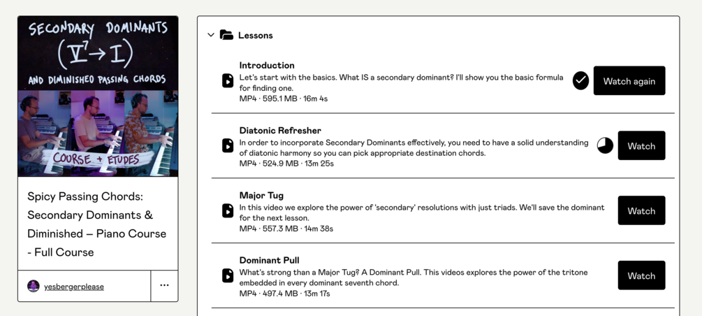 Basically, as long as you have a handle of triads and understand what it takes to build a dominant seventh chord (don't worry, I offer a refresher in the course), then you're ready to dive right in! With five hours of video lessons featuring live whiteboards, an overhead camera and a teacher shot, you'll have everything you need to play along with me and absorb these concepts as I demonstrate them from various angles and in numerous different keys. Gumroad also keeps track of your video progress and allows you to adjust the speed as you learn.